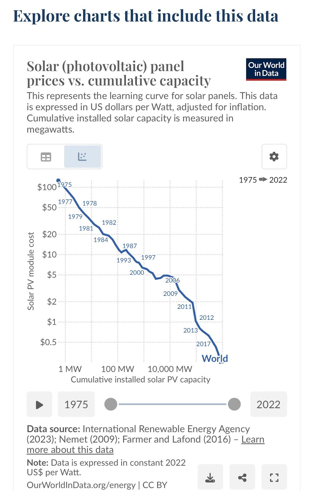 Ausführlich beschäftigt sich damit eine aktuelle und vielbeachtete Analyse des Rocky Mountain Institute (RMI). Eine Zusammenfassung der Studie hat beispielsweise Cleanthinking bei X veröffentlicht. Das Fazit: Die orthodoxe Sichtweise des langsamen Wandels ist falsch. Die Cleantech-Kosten sind um bis zu 80 Prozent gesunken, während sich die Investitionen fast verzehnfacht und die Solarerzeugung verzwölffacht hat. Das exponentielle Wachstum von Cleantech wird sich also fortsetzen – das System der fossilen Brennstoffe steht vor einem unaufhaltsamen Niedergang.
